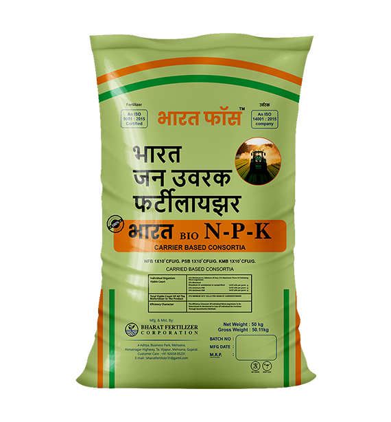 ભારત ફોર્સ :50 Kg. નાઈટ્રોજન, ફોસ્ફરસ અને પોટાશના બેકટરીયા રહેલા છે, જે જમીનમાં રહેલ અલભ્ય ફોસ્ફરસ અને પોટાશને લભ્ય બનાવે છે. હવામાંથી નાઈટ્રોજનનું સ્થીરીકરણ કરી છોડને નાઈટ્રોજન પુરો પાડે છે. છોડમાં નવી કોષીકાઓનું ઝડપથી નિર્માણ કરે છે જેનાથી છોડમાં કોષ વિભાજનનું કાર્ય ઝડપથી થાય છે. જમીનમાં નિષ્ક્રિય એન.પી.કે. ને ક્રિયાશીલ બનાવી એમીનો એસીડની માત્રામાં વધારો કરી પ્રોટીન નિર્માણમાં મદદ કરે છે. ઉપયોગથી પાકનો વિકાસ, તંદુરસ્તી, ફળની સાઈઝ, વજનમાં મોટા પ્રમાણમાં વધારો કરે છે. જેથી ઉત્પાદનમાં ૧૫% થી ર૦% નો વધારો થાય છે. અન્ય ખાતર વાપરવાની જરૂર રહેતી નથી.