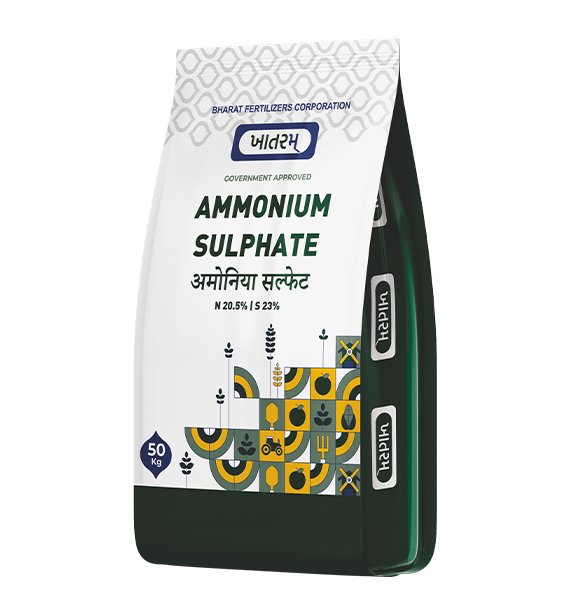 એમોનીયમ સલ્ફેટ: 50 Kg. નાઈટ્રોજન : ૨૦.૫%, સલ્ફર : ૨૩% નાઈટ્રોજન (એમોનિકલ સ્વરૂપ) છોડનાં સંપૂર્ણ જીવનક્રમ દરમ્યાન સરળતાથી ઉપલબ્ધ થાય છે. સલ્ફર તેલીબીયા પાકમાં તેલનું પ્રમાણ વધારે છે. પોષક દ્રવ્યો અને પ્રોટીનના ઉત્પાદનને સક્રિય કરે છે. યુરિયાની સરખામણીએ નિતાર અને બાષ્પીભવનથી ન્યુનતમ વ્યય થવાથી વધુ ફાયદાકારક છે. જંતુનાશક ગુણ ધરાવે છે.