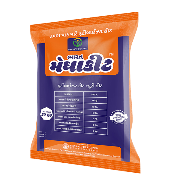 ભારત મેઘાકીટ એ તમામ પ્રકારના પાકો માટે સંપૂર્ણ પોષણ આપતું યુનિક ફર્ટિલાઈઝર કીટ છે,